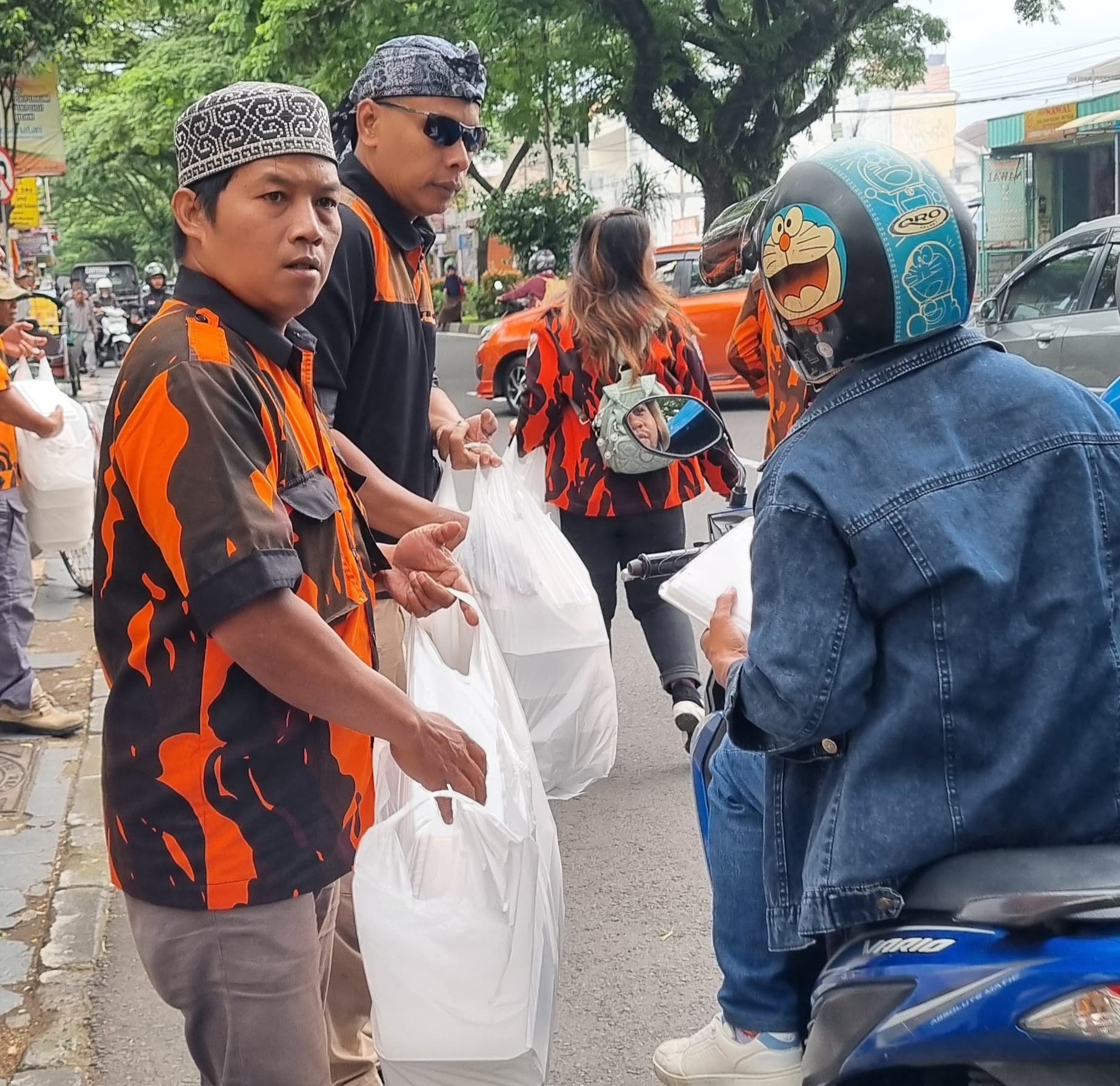 Tampak dengan kompak mereka membagikan kurang lebih 200 nasi kotak kepada para pengguna jalan yang melintas, sopir angkot, Ojol, serta tukang becak.