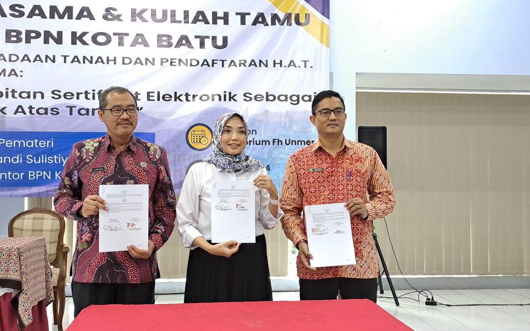 MALANGPOINT.COM | KOTA MALANG – Upaya untuk memperkuat sinergi antara dunia akademik dan praktik profesional di bidang pertanahan dan hukum agraria. Fakultas Hukum Universitas Merdeka Malang (UNMER Malang) menjalin kerjasama dengan Badan Pertanahan Nasional (BPN) Kota Malang dan BPN Kota Batu.