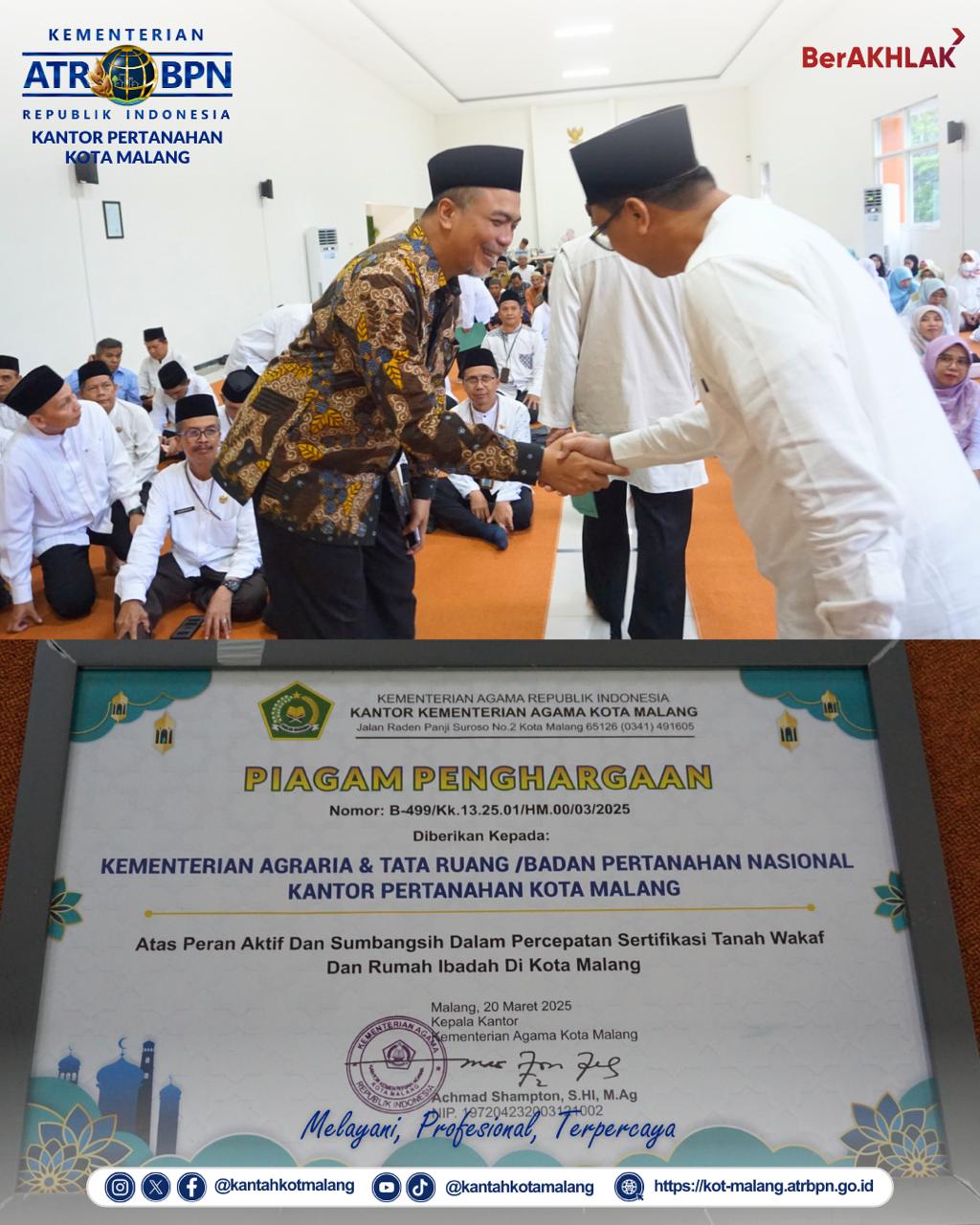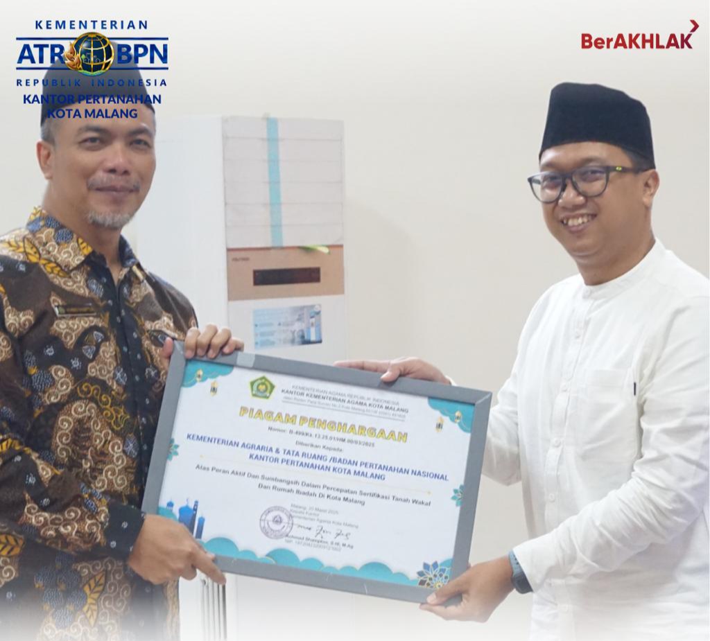 Kantor Pertanahan Kota Malang Dapat Penghargaan Atas Percepatan Sertifikasi Tanah Wakaf dan Rumah Ibadah