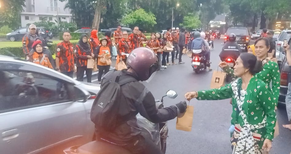 Tampak antusias para pengurus, anggota dan kader Pemuda Pancasila Kota Malang, DPC Srikandi PP Kota Malang, Koti Mahatidana PP Kota Malang, serta ibu-ibu kebaya dari Jowo Line Dance membagikan ratusan takjil kepada pengguna jalan yang melintas baik pendendara roda dua dan empat.