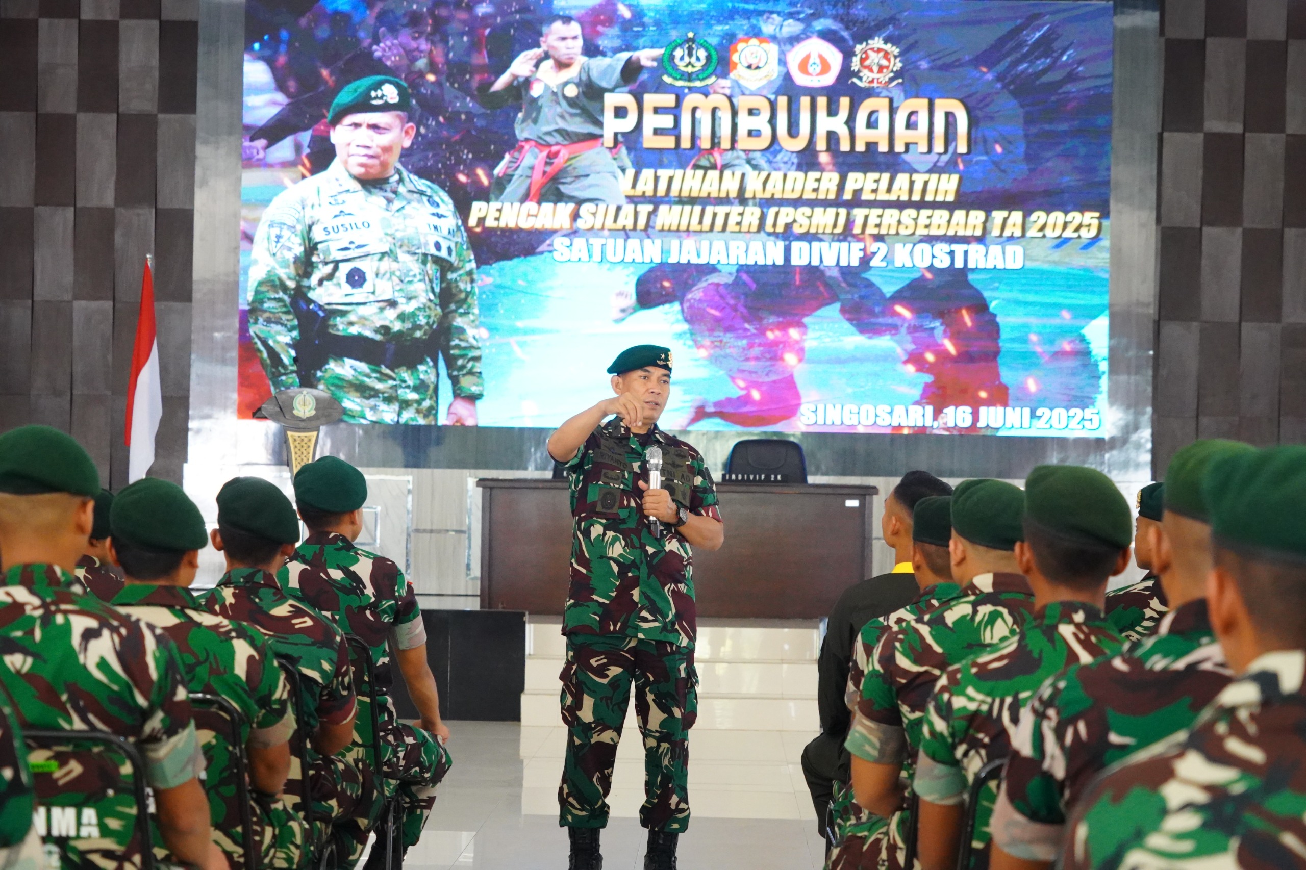 MALANGPOINT.COM | MALANG – Tradisi dan ketangguhan berpadu dalam Latihan Kader Pelatih Pencak Silat Militer (PSM) Divif 2 Kostrad 2025 resmi dibuka oleh Kepala Staf Divisi Infanteri 2 Kostrad, Brigjen TNI Riyanto, S.I.P., di Madivif 2 Kostrad, Singosari, Kabupaten Malang, Jawa Timur, Senin (16/6/2025).