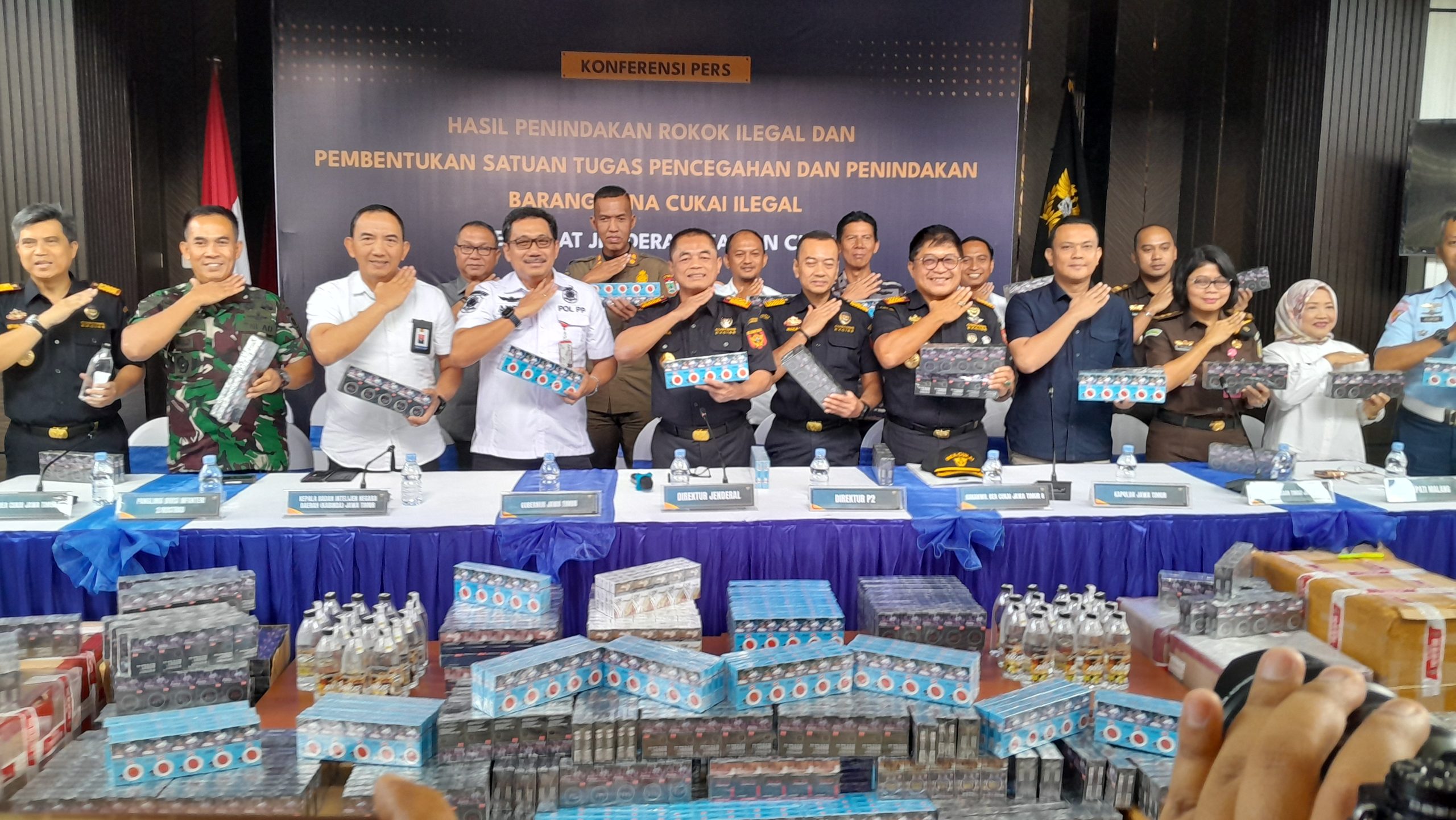 Direktur Jenderal Bea dan Cukai, Letjen TNI (Purn) Djaka Budhi Utama ssat konferensi pers di Kanwil Bea Cukai Jawa Timur II menyampaikan, pembentukan Satgas Pencegahan dan Penindakan Barang Kena Cukai llegal menandai komitmen pemerintah dalam menjaga stabilitas penerimaan negara serta menciptakan iklim usaha yang sehat dan berkeadilan di bidang cukai.