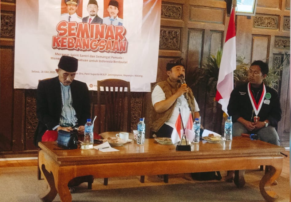MALANGPOINT.COM | DPC GMNI Kabupaten Malang menggelar seminar kebangsaan dengan tema “Merawat Spirit Santri dan Semangat Pemuda: Meneguhkan Persatuan untuk Indonesia Berdaulat”, bertempat di aula kediaman Drs.Peni Suparto, M.A.P, Jatirejoyoso, Kabupaten Malang, Selasa, (28/10/2025).