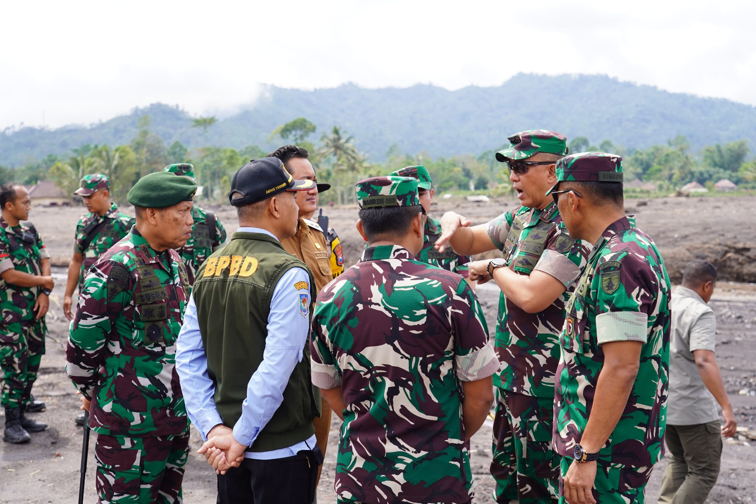 MALANGPOINT.COM | Panglima Divif 2 Kostrad Mayjen TNI Susilo bersama Pangdam V/Brw Mayjen TNI Rudy Saladin, didampingi jajaran Forkopimda Kabupaten Lumajang meninjau langsung lokasi terdampak erupsi Gunung Semeru, Senin (24/11/2025)