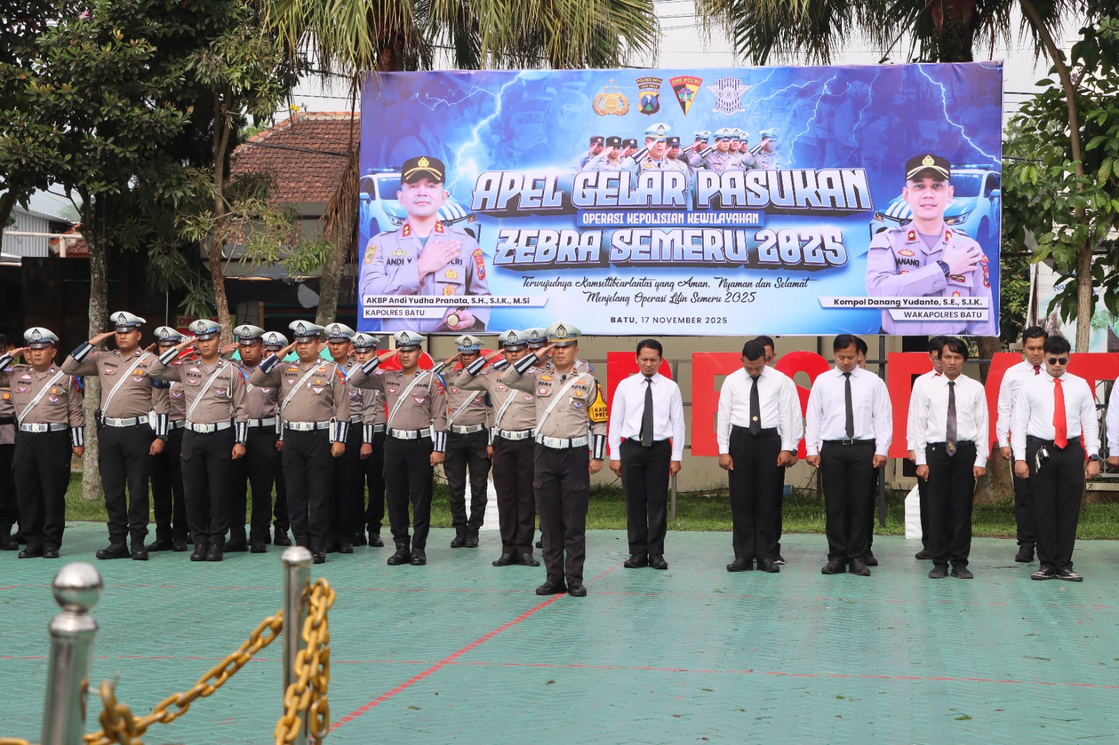 MALANGPOINT.COM | Kapolres Batu AKBP Andi Yudha Pranata, S.H., S.I.K., M.Si memimpin Apel Gelar Pasukan Operasi Zebra Semeru 2025 yang berlangsung di halaman Mako Polres Batu pada Senin pagi. (17/11/2025)