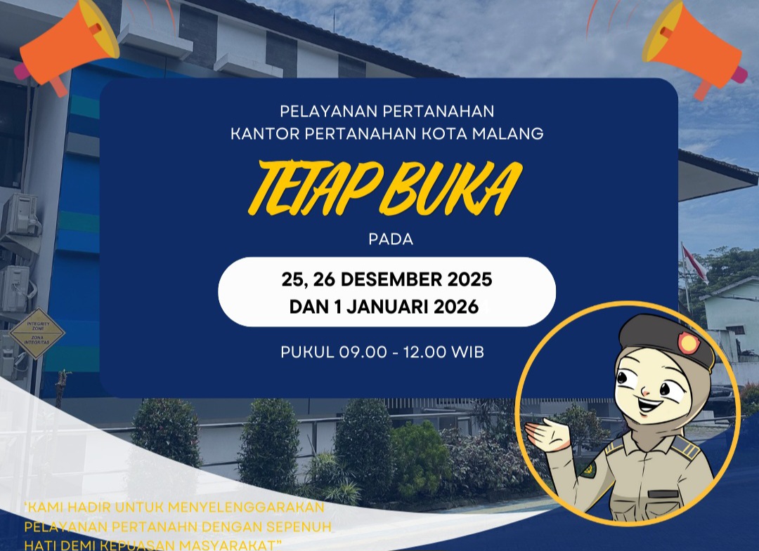 MALANGPOINT.COM | Dalam rangka tetap memberikan pelayanan terbaik kepada masyarakat, Kantor Pertanahan Kota Malang menyampaikan bahwa pelayanan pertanahan TETAP BUKA pada: