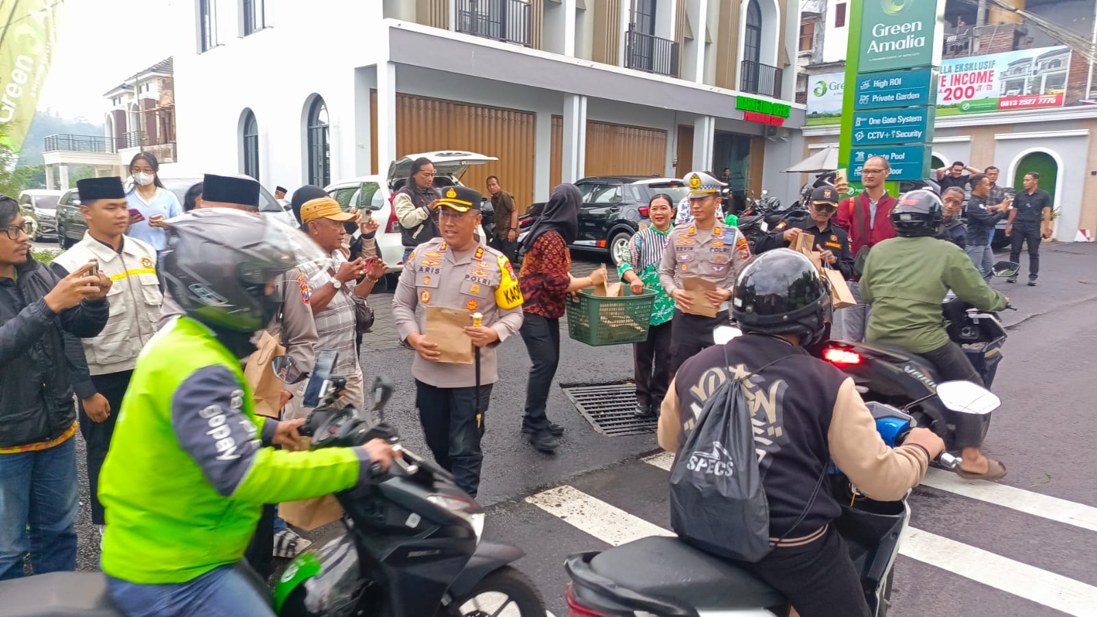 “Hari ini kita siapkan kurang lebih 200 bingkisan takjil. Alhamdulillah antusiasme masyarakat sangat luar biasa, baru sebentar dibagikan setengahnya sudah ludes. Sambil berbagi, kami juga membagikan brosur berisi imbauan agar masyarakat tetap tertib selama bulan suci ini,” ujar AKBP Aris Purwanto